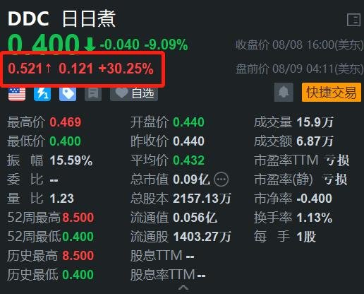 格隆汇8月9日|日日煮(DDC.US)美股盘前反弹30.25%证券公司有股票操盘手吗,报0.521美元。该股自从6月中旬大涨以来持续走低,昨日跌9%创下历史新低价。公司专注于创新和健康的膳食解决方案,拥有在中国和美国快速增长的全渠道销售网络,并在全球拥有强大的线上渠道影响力。值得一提的是,在6月中旬,公司正式宣布收购了在美国备受欢迎的亚洲风味食品品牌Omsom。