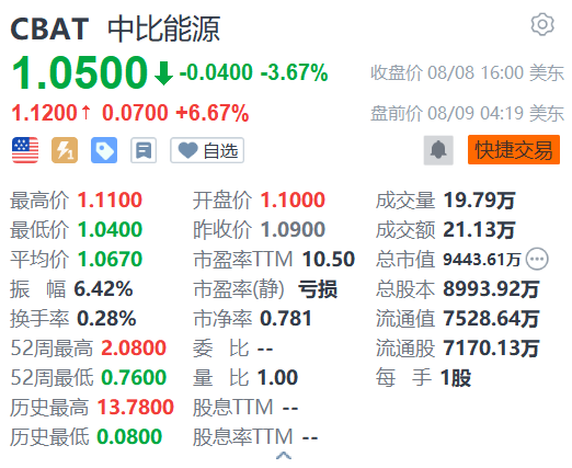 格隆汇8月9日|中比能源(CBAT.US)盘前涨6.67%,报1.12美元。中比能源是全球领先的集锂离子电池研发、生产、销售为一体的高新企业,产品主要为圆柱锂离子电池期货股票配资门户,应用覆盖电动车、储能等领域。公司将于美东时间8月9日盘前公布2024年二季度及上半年业绩。